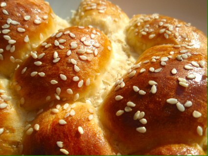 Our church had a Thanksgiving Eve dinner and worship with communion. As the challah was broken I thought of its symbolism as the Sabbath bread of Judaism. According to my bread mentor, Peter Reinhart, the three strands of this braided loaf symbolize peace, beauty and truth. The braids separate the loaf in twelve sections representing the twelve tribes of Israel, and sesame or poppy seeds on top symbolize manna falling from heaven.