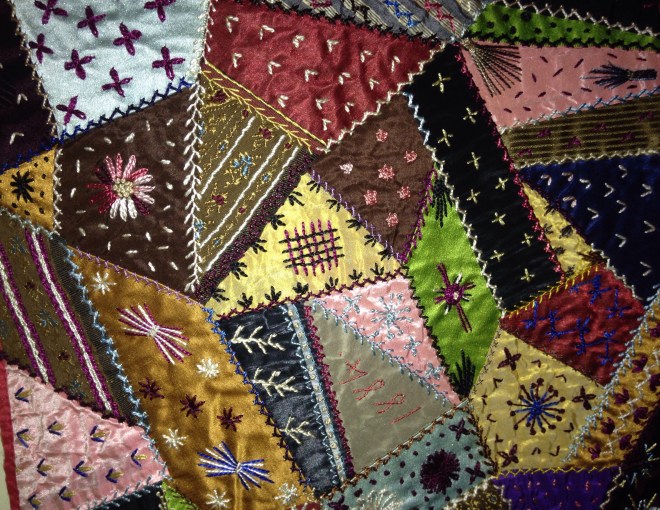 Today, I sorted through many boxes of past memories as we continue to organize our basement. A family quilt hanging in our dining room beckoned me to observe the embroidered blocks more closely. Each quilt pattern, thirty-six blocks in all, was stitched by a different person, and that person either stamped with ink or embroidered their name on the block. In some instances, locations such as Boston and Roxbury, MA; Bangor, ME; and even poetry were included. Some of the individual quilt patterns include “Flying Geese”, “Friendship Star”, “Maltese Cross” and “Jacob’s Ladder”. Although I know very little about quilts, I feel a close connection to family through this special piece of art.