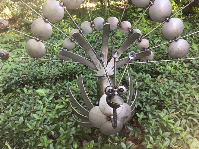 My husband is so wonderful. He hates to shop, yet spent two hours in the heat and humidity, which he may dislike even more than shopping! We enjoyed the Laumeier Sculpture Park Art Fair this weekend and found this metal peacock for our garden. We both agree it may have been a purchase-on-a-whim, but we couldn’t pass up his face. After placing it in a suitable spot, it looks as if this peacock has found a home.