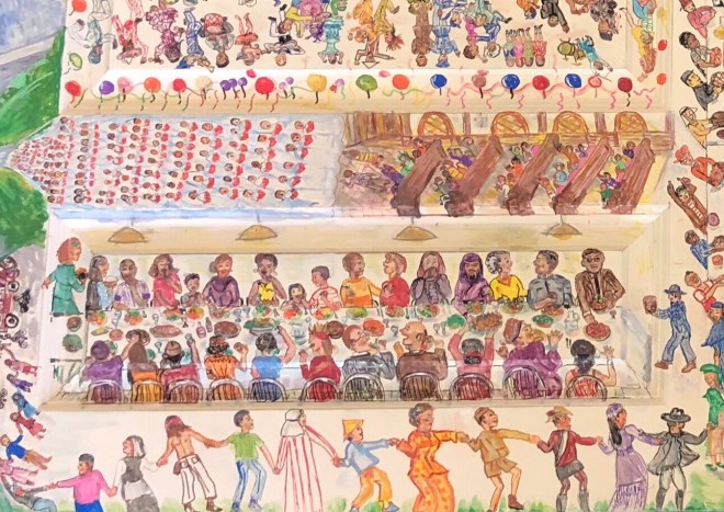 As the door nears completion, artist Marilyn Smith captures poignant moments of touch between peoples of all nationalities and walks of life. These individuals hold hands around the perimeter of the door, leading each other in laughter and dance to the joyful feast of the people of God. Oh, what a wonderful world this would be if we could all feast with one another.