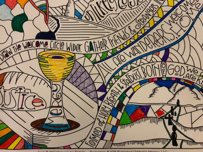 A poster, designed by Adam Walker Cleaveland, is in the prayer room. It was created to reflect our commissioned hymn, and it gains more and more bits of color each day. I love that it truly is “gathering friends and strangers in” to add their own pieces of color. I wonder what pieces of prayer will show up tomorrow.