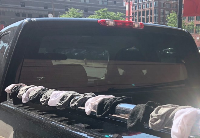 My day began with an unexpected series of events. I’ll share one: the labyrinth socks weren’t dry. A very kind person washed them overnight, but the hotel dryer must not have worked since they were still wet hours later. They were handed to me along with another kind person’s hairdryer borrowed from her hotel room. I decided I didn’t want to spend the morning drying socks with a hairdryer, so I promptly headed outside to line them up in an obscure place along the convention center sidewalk. Theo, the door greeter, was another very kind soul. Watching me carefully placing socks, he came outside and offered the use of his truck rack to serve as a dryer. How wonderful! Not only did the hot air dry them in no time, but it brought a few chuckles from people heading to meetings.