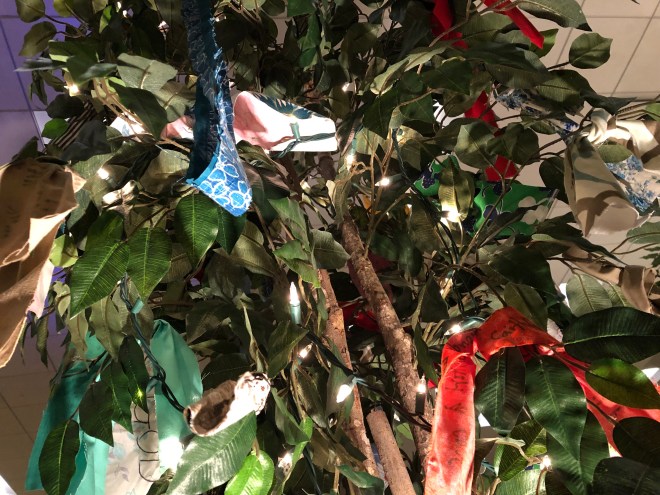 They began naked; adorned with only leaves. Now their branches are laden with strips of fabric of all sizes and colors, but they are more than just ornaments. Each piece contains a prayer from someone who visited the prayer room this past week at General Assembly. I watched as people carefully selected a piece of cloth. Some wrote messages and dipped them in the font before hanging them on the trees. Another person I spoke with visited the room multiple times to pray. He told me his story while his hand was wrapped with a cloth in prayer. He tightly held that prayer in love and came back each day to pray again and again. Even on the final day as we were disassembling the room, he showed up to take another piece of cloth to pray with. I don’t know what he held in prayer or who he prayed for, but I do know that his faith is deep and God is listening.