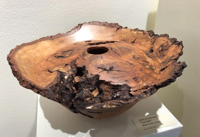 The art exhibit I viewed at the monastery includes beautiful wood creations by Keith Armstrong. In his artist’s statement, Keith says, “Wood speaks to him (the artist), telling him what it wants. Often the artist’s plan must be set aside so that the wood’s desires can be revealed. Cracks, worm holes, bark, stains, bacterial decay and water all play a part in making a piece come alive. Although the cells have long since stopped being active, the wood of a tree has life. As nature works on the wood, it metamorphoses. The artist’s plan must respond to what is discovered after layer by layer the wood’s true nature is revealed.”