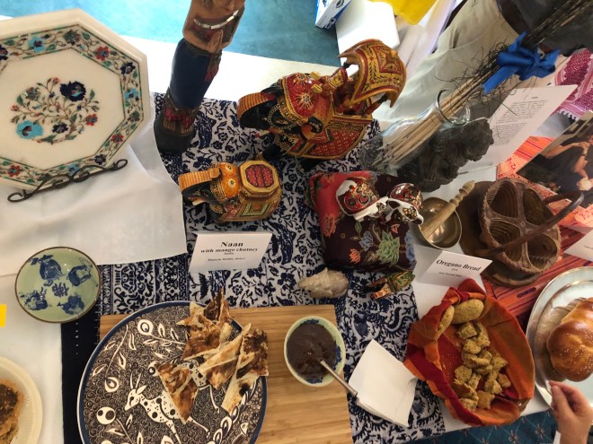 The magenta amaranth was drooping in the grain arrangement displayed for World Communion Sunday. I was tempted to harvest more. I likely hadn’t watered the amaranth enough, and it was front and center among the sorghum, rice, millet and sesame. Then I awakened to the beauty of the plants in all stages of their lives; grains dying to new life. Bread. Bread looks and tastes different in other parts of the world, and I find beauty in that too. I have allowed my deepest self to be touched by flavors unfamiliar to me. By trying new spices, grains, and recipes from other regions, my senses are awakened and I learn about other cultures more than any book I’ve read or class I’ve taken. The practice of baking bread has become prayer for me, and I feel and smell God’s goodness in every loaf. Bread is life and bread is love. But love means nothing if it is not shared. Love abounded on World Communion Sunday as more than sixty church members shared global artifacts and linens, photographs, stories, served as hosts, and offered bread created with their own hands. I loved seeing children and adults moving to the energetic beat of the bongos. I’m sure God was smiling and dancing along as well.