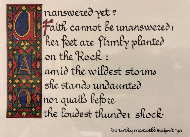 A member of our congregation gave me this beautifully calligraphed artwork twenty years ago. It hangs on the wall by my desk and I am empowered by it each day. Whenever I doubt or am going through difficult times in life, this text reminds me that all I need is faith in Christ, the sure foundation. By reading and sharing with me through these stories, you have been my foundation and support along the way. Throughout this journey, you are the beauty of God’s creation that keeps me going down the path; even through the wildest storms. We will always encounter storms. If we had no storms, how could we learn to appreciate peace and experience true joy?