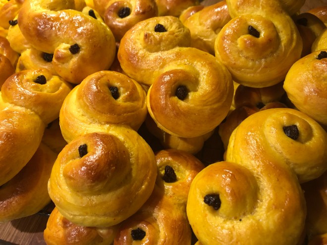 While in Sweden I baked a traditional Swedish bread; Lussebullar (golden yellow saffron buns) as an early celebration of Santa Lucia Day (December 13th). Saint Lucy was a 3rd-century martyr who, according to legend, brought food and aid to Christians hiding in the catacombs. She wore a candle-lit wreath on her head to light the way and leave her hands free to carry as much food as possible.