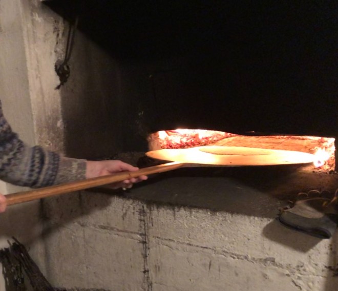According to the United Nations Educational Scientific and Cultural Organization, “Östersund is widely appreciated for its gastronomic culture, based on local sustainable food inspired from longstanding culinary traditions.” One of my favorite experiences while staying with family this past week was mixing, rolling and fire-baking Tunnbröd (thin bread) in their century-old outdoor brick oven. Tunnbröd is full of wonderfully fragrant ingredients such as anise and fennel, and this version contains multiple grains including graham, oat and rye. They taught me how to use special rolling pins with grooves, and another one for pricking the thin dough disc until it was gently but quickly tossed from the long wooden paddle onto the extremely hot brick oven floor. In seconds the dough began to turn black. When we removed it, the Tunnbröd was beautifully tinged with burnt edges. We enjoyed it, hot and freshly blackened, with butter.
