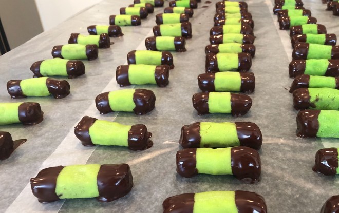 I was introduced to many unfamiliar baked goods while in Sweden. Dammsugare, an old Swedish classic, means “vacuum cleaner” and is made to resemble the cylinders of old vacuum cleaners. There is also a theory that they were created as a way to use the leftover cake crumbs at the end of the day (“vacuumed” up), since cake crumbs are used in the filling. I was reluctant to try this green colored confection, but I am so glad I did. The unexpected flavors combined to create a lasting tasteful memory. When I returned home I researched recipes and each one is a bit different. I learned that most Swedes purchase theirs, and after making these from scratch, I understand why. One must already have a batch of cookies or cake to provide the interior crumb base. The secret ingredient that exhilarated my taste buds is Swedish punsch (arrack or aniseed liqueur). While making the marzipan, I tried a batch with bitter almond extract from Sweden. Wow – so pleasingly potent! The surprise ingredient in the marzipan is rose water. It is subtle amidst all the almond flavor, but adds a floral depth. After making the filling and marzipan, I took all the pieces of leftover delicious chocolate bars from 2018 and melted them for the final dip. I don’t know how many pounds of chocolate I brought back from Scandinavia to give as gifts and to replace the stash I keep in my desk, but the customs officer did remark on how I must love chocolate. I brought back many pounds of something else, but that’s a story for another day…I’ll just say the extra bags were worth it!