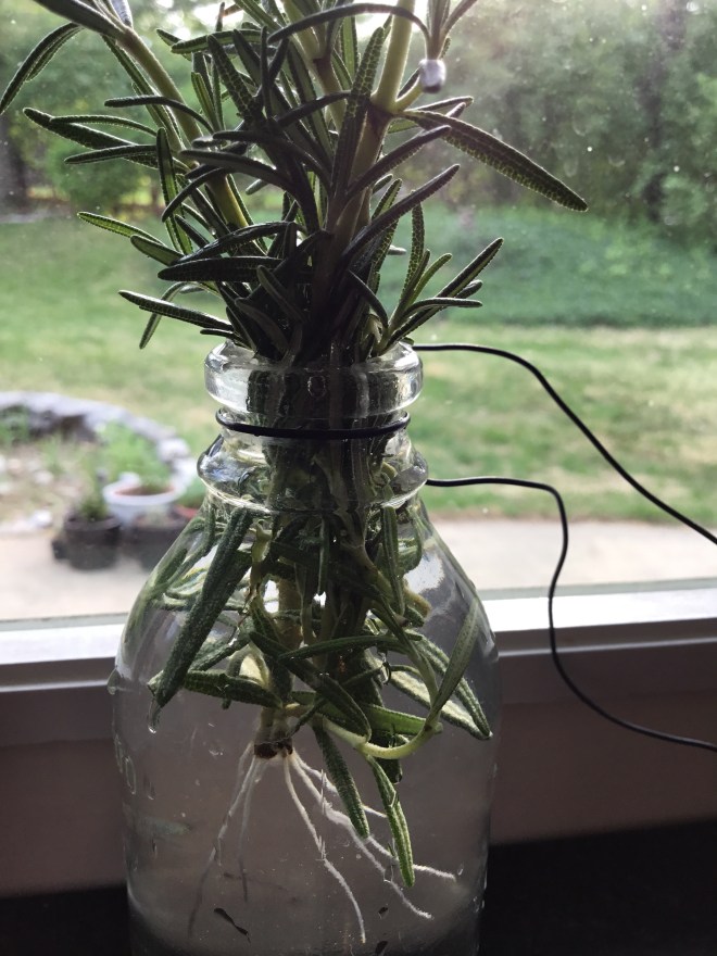 I have much to learn about many, many things. One thing I did not know, until discovering just a few days ago, that a rosemary clipping can root. I’m quite excited to learn this since I don’t have much luck keeping rosemary alive. So now I can take sprigs from the “mother plant” and maybe, just maybe, have a greater chance of at least one lasting throughout the year.